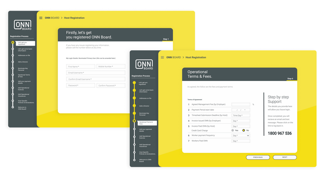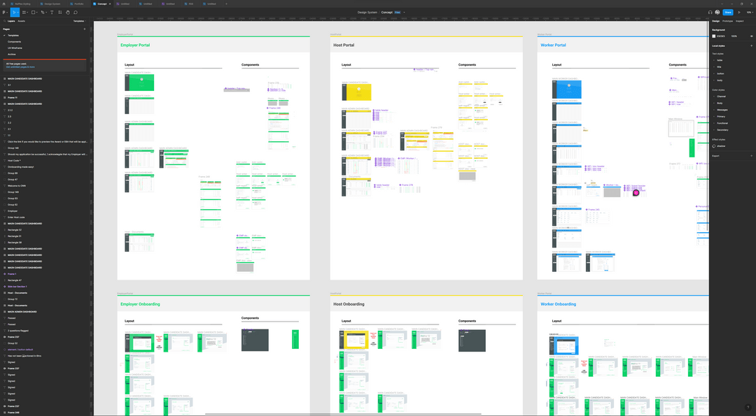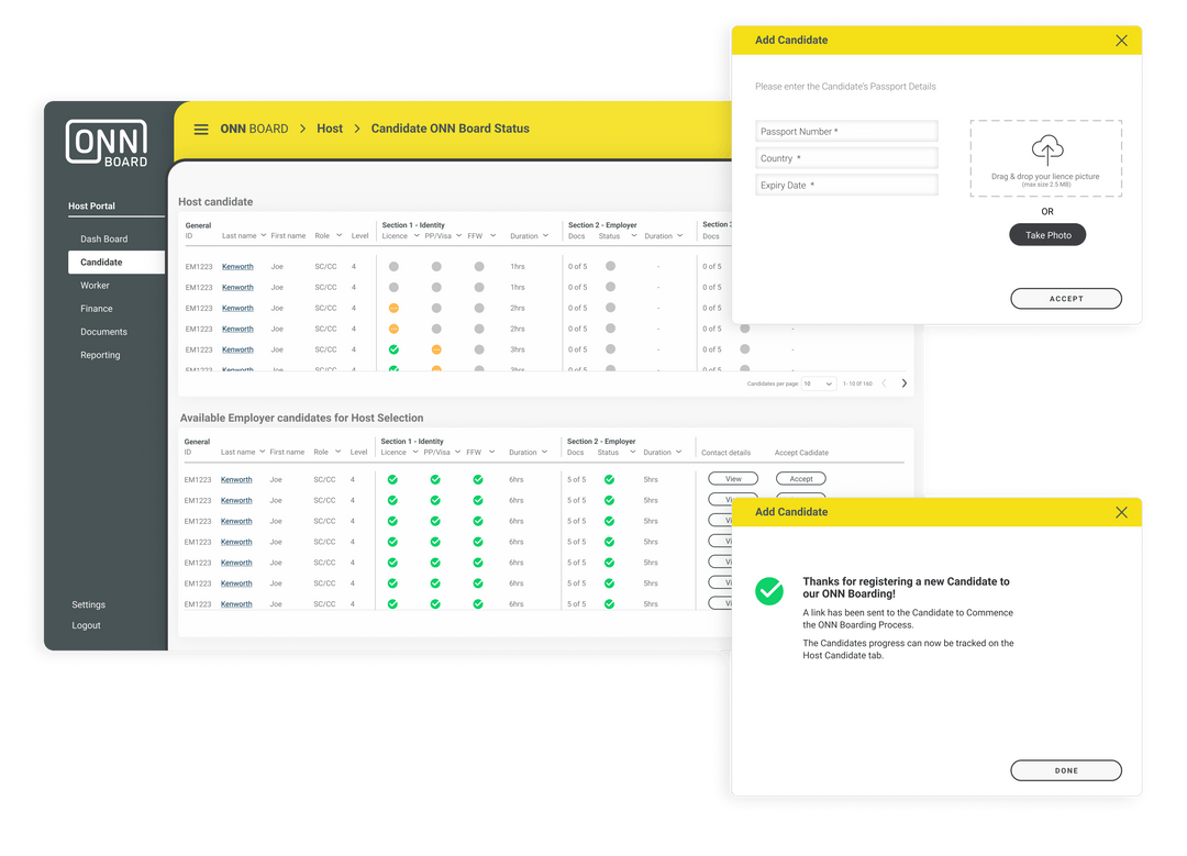 The aim was to create three different levels of access. Employer Portal: admin level rights to the system. Host Portal: for a company access the pool of candidate and add them to their workforce. Worker Portal: so they can monitor and add the required information in the onboading proccess, see where they have been allocated and access payslips roster etc.